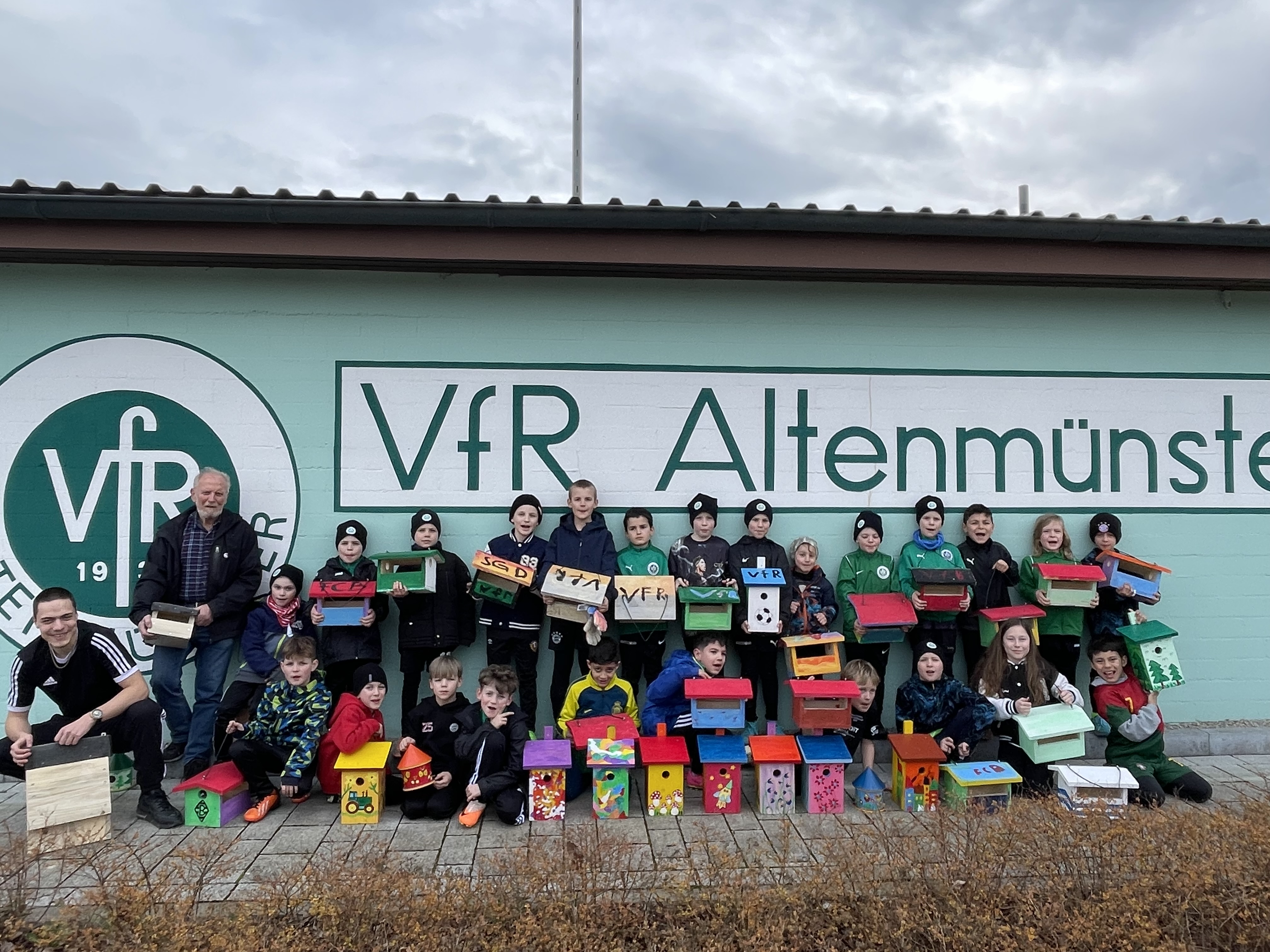 24 Kinder der G-, F- und E-Junioren des VfR Altenmünster beteiligten sich an der Aktion zum Schutz einheimischer Singvögel. Zusammen mit den NABU-Beauftragten Erich Beyerbach und Loisl Schilling wurden selbst gefertigte Nistkästen auf dem Vereinsgelände des VfR Altenmünster angebracht.